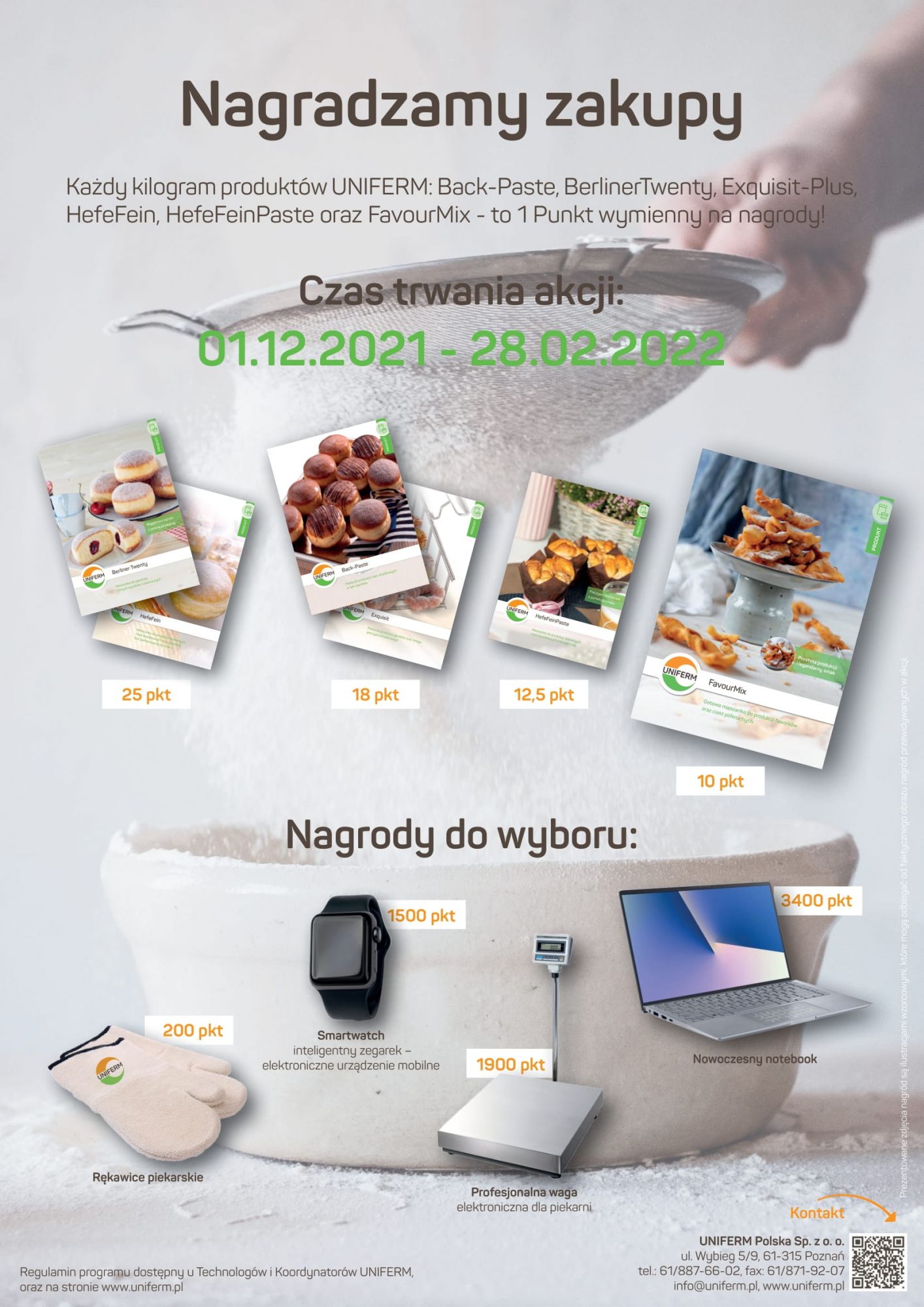 Od grudnia każdy Klient, który podpisze wcześniej deklarację przystąpienia do programu z nagrodami, za zakupione u naszych Dystrybutorów kilogramy produktów do pączków UNIFERM, biorących udział w promocji, otrzymuje punkty, aby ostatecznie wymienić je na atrakcyjne nagrody. Do zdobycia między innymi nowoczesny notebook, funkcjonalny smartwatch czy rękawice piekarskie!