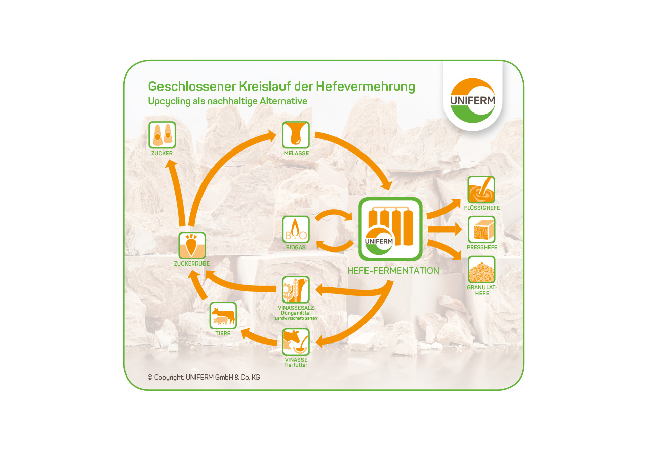 Im Rahmen der Hefevermehrung leistet UNIFERM einen wertvollen Beitrag für ein nachhaltiges Wirtschaften. Dabei verwendet UNIFERM Melasse, die bei der Gewinnung von Zucker aus heimischen Zuckerrüben anfällt. Melasse liefert wertvolle Nährstoffe für den natürlichen Fermentationsprozess der Hefe. Bei der Hefevermehrung entsteht die sogenannte Hefewürze. Aus ihr wird die Hefemilch separiert, aus der im Weiteren die verschiedenen Hefesorten entstehen. Übrig bleibt die enthefte Würze, eine Flüssigkeit, die wiederum Nährstoffe enthält. Die enthefte Würze durchläuft eine aufwendige Aufbereitung und erfährt so eine stoffliche Aufwertung. Sie wird zur weiteren Nutzung als wertvoller Bestandteil von Tierfutter (Vinasse) oder als natürliches Düngemittel (Vinassesalz) in den Agrarkreislauf zurückgeführt. Sie trifft hier auf eine hohe Nachfrage nach hochwertigen pflanzlichen Nährstoffen. Daneben wird die enthefte Würze einer energetischen Verwertung im Rahmen der Biogasproduktion zugeführt. Über beide Wege erreicht UNIFERM eine Reduktion der Emissionen. UNIFERM verfolgt das Ziel einer maximalen Verwertung.
