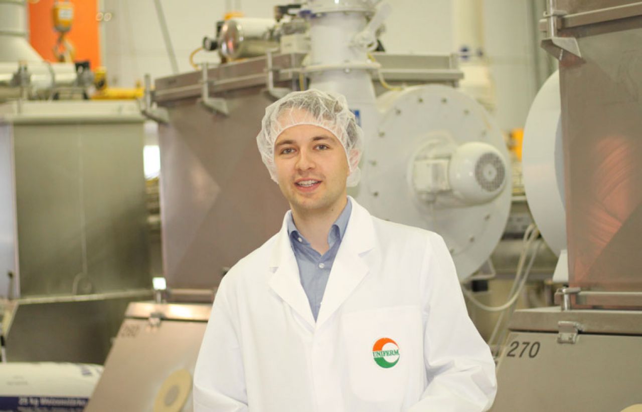 Arne Groneick hat die Backmittelproduktion als Assistent der Produktionsleitung im Blick und sorgt für einen reibungslosen Produktionsablauf. Er ist ebenfalls Teilnehmer unseres Entwicklungsprogramms UNIfit.